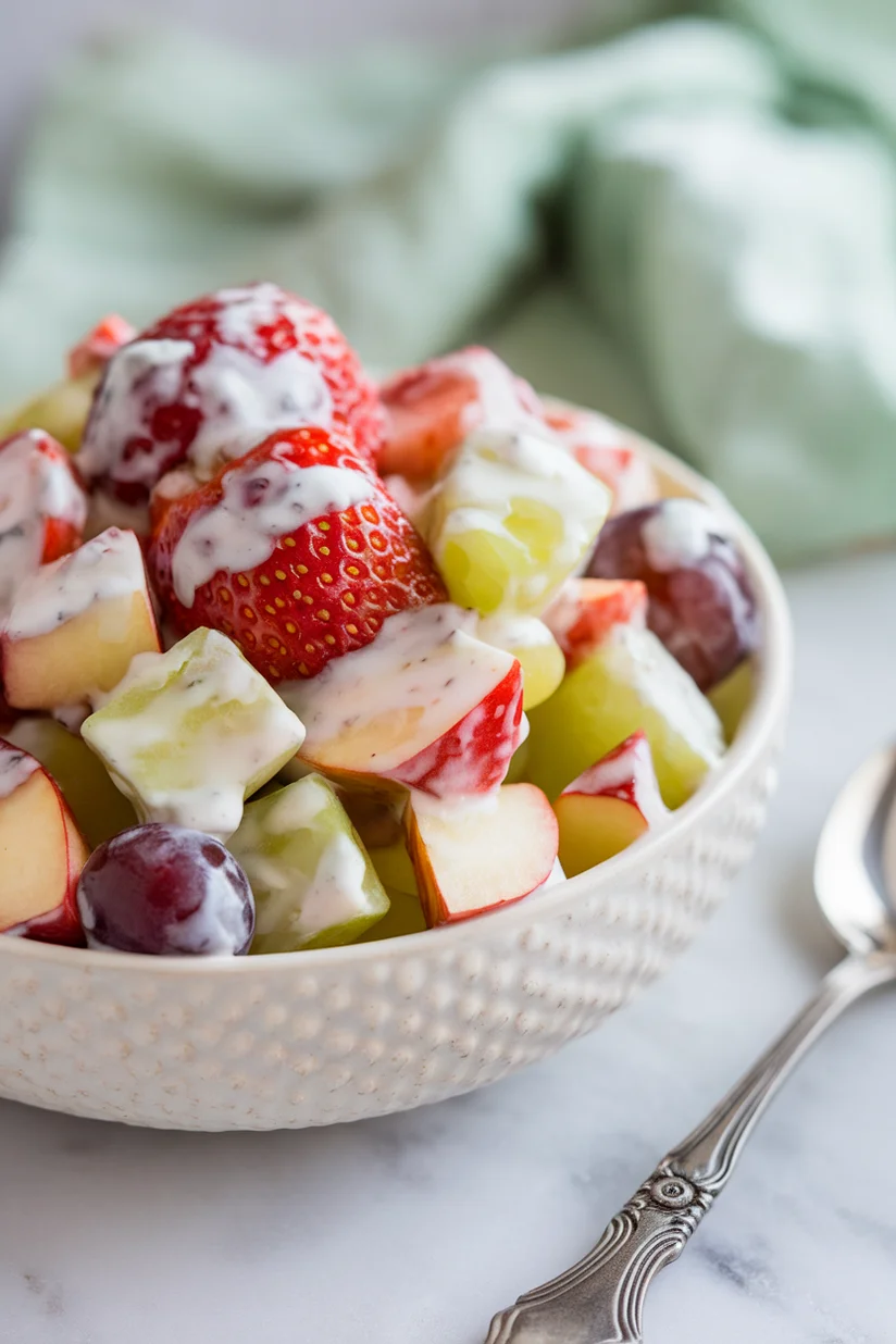 This creamy fruit salad is a delightful blend of textures and flavors, perfect for a refreshing treat or a light dessert.